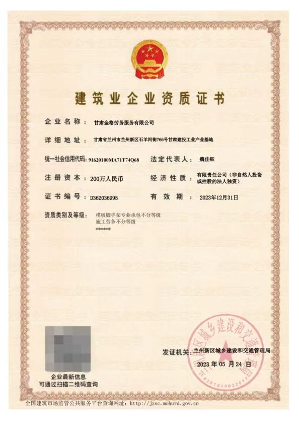 喜報!甘肅金格勞務(wù)服務(wù)有限公司成功增項模板腳手架專業(yè)承包不分等級資質(zhì)!