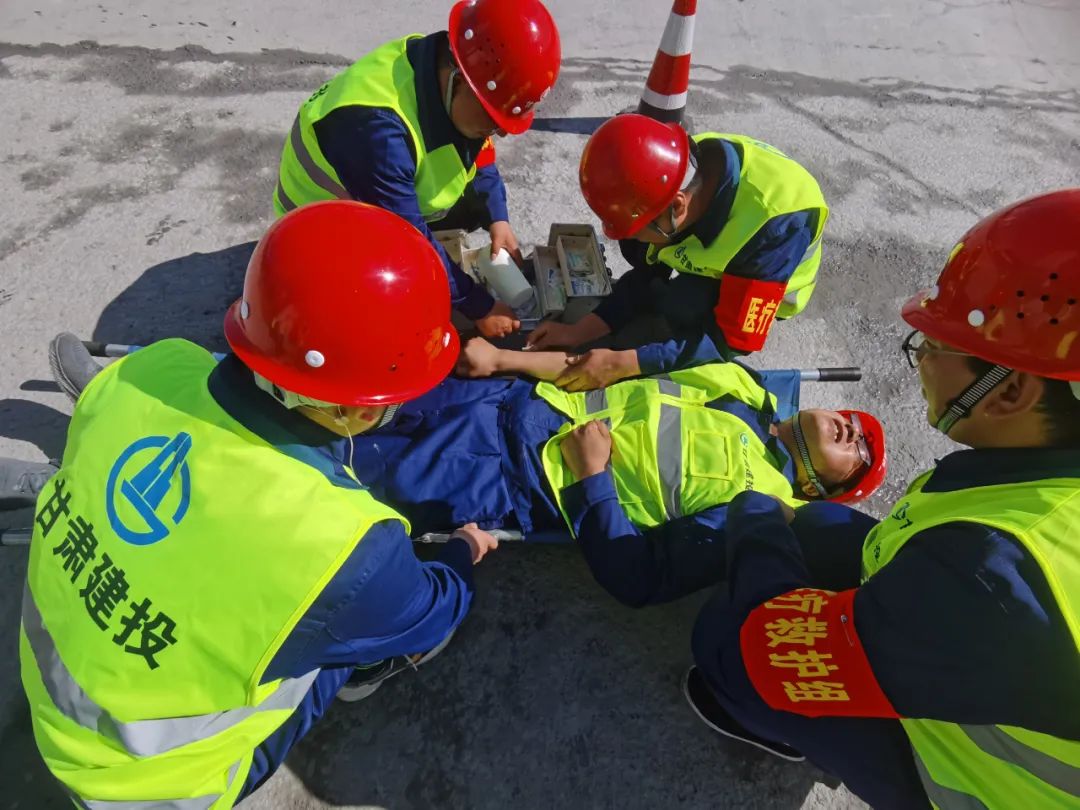 預(yù)設(shè)的場景以操作工人維修水穩(wěn)拌合站皮帶機(jī)時,發(fā)生皮帶夾傷事故為背景,開展應(yīng)急演練。事故發(fā)生后,施工操作班組第一時間向拌合站匯報(bào)情況,拌合站立即成立現(xiàn)場指揮部,迅速啟動應(yīng)急預(yù)案,組建警戒聯(lián)絡(luò)組、應(yīng)急救援組、醫(yī)療救護(hù)組、后勤保障組等4個應(yīng)急小組,有序開展人員搶救工作。在按照應(yīng)急預(yù)案進(jìn)行緊張有序處置后,模擬受傷的人員得到妥善救治,演練過程中各小組行動迅速、配合有序、處置得當(dāng),圓滿完成了演練任務(wù)。