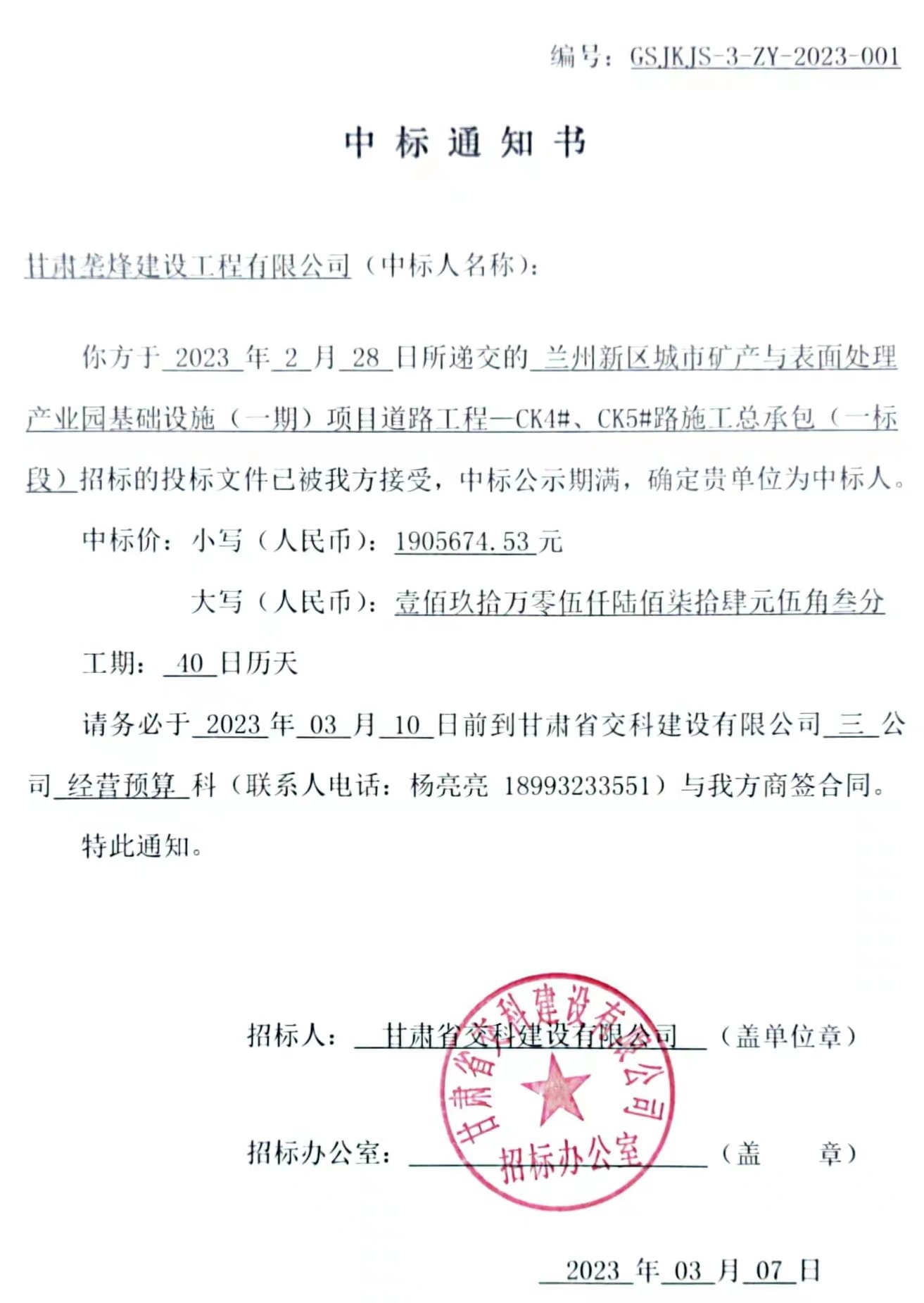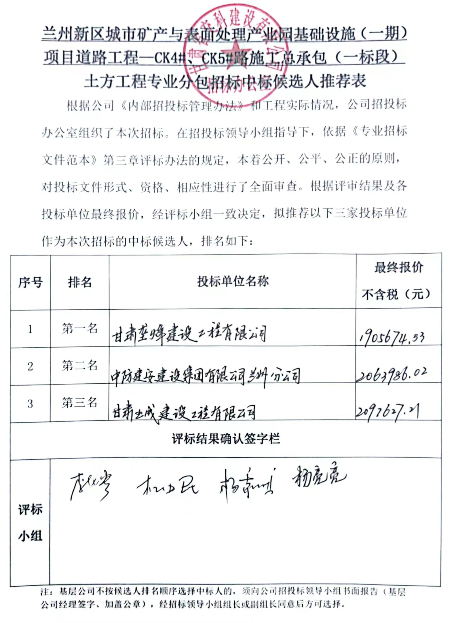 蘭州新區(qū)城市礦產(chǎn)與表面處理產(chǎn)業(yè)園基礎(chǔ)設(shè)施(一期)項目道路工程—CK4#、CK5#路施工總承包(一標段)中標候選人及中標通知書