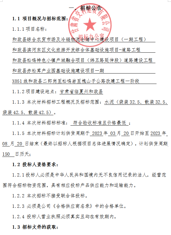和政縣綜合農(nóng)貿(mào)市場及冷鏈物流倉儲中心建設(shè)項(xiàng)目(一期工程);和政縣濱河?xùn)|區(qū)文化旅游開發(fā)綜合體基礎(chǔ)設(shè)施項(xiàng)目-道路工程 ;和政縣松鳴特色小鎮(zhèn)產(chǎn)城融合項(xiàng)目(緯五路延伸段)道路建設(shè)工程;和政縣赤松茸產(chǎn)業(yè)園基礎(chǔ)設(shè)施建設(shè)項(xiàng)目一期;X051線和政縣二郎崗至松鳴巖至槐山子公路改建工程一材料招標(biāo)公告