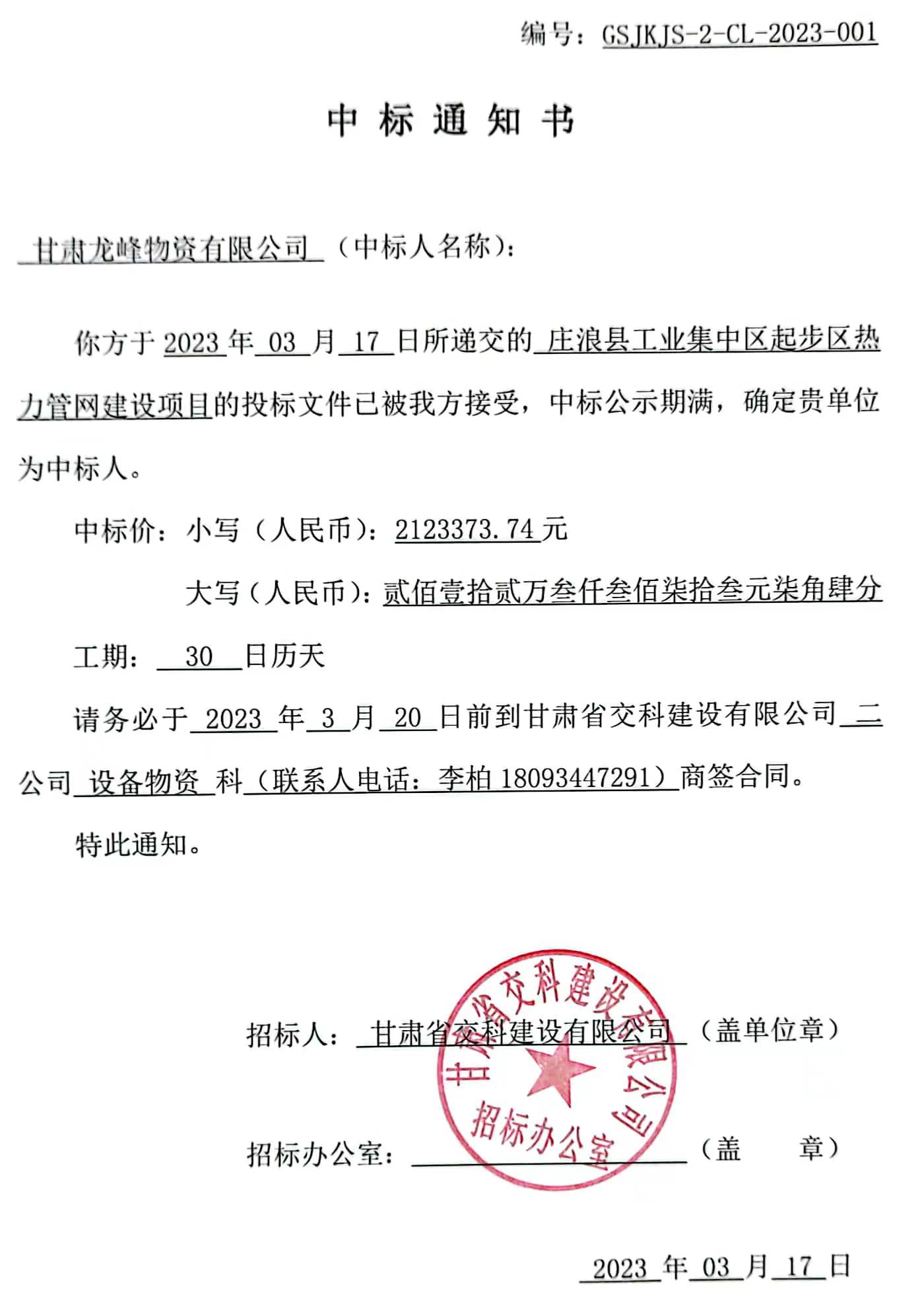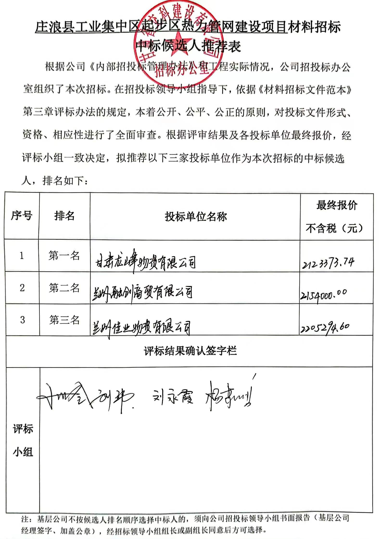 莊浪縣工業(yè)集中區(qū)起步區(qū)熱力管網(wǎng)建設(shè)項(xiàng)目招標(biāo)候選人及中標(biāo)通知書