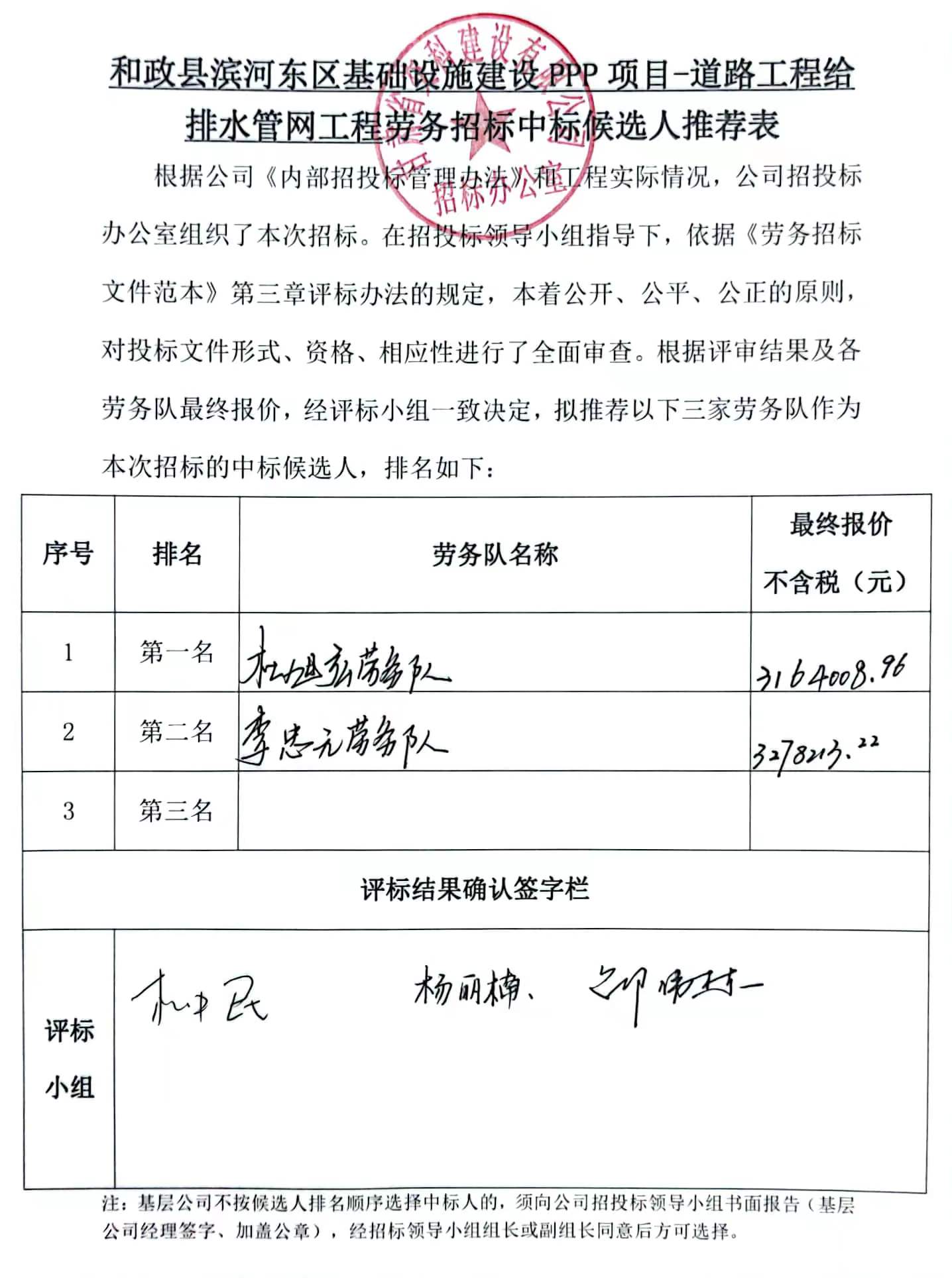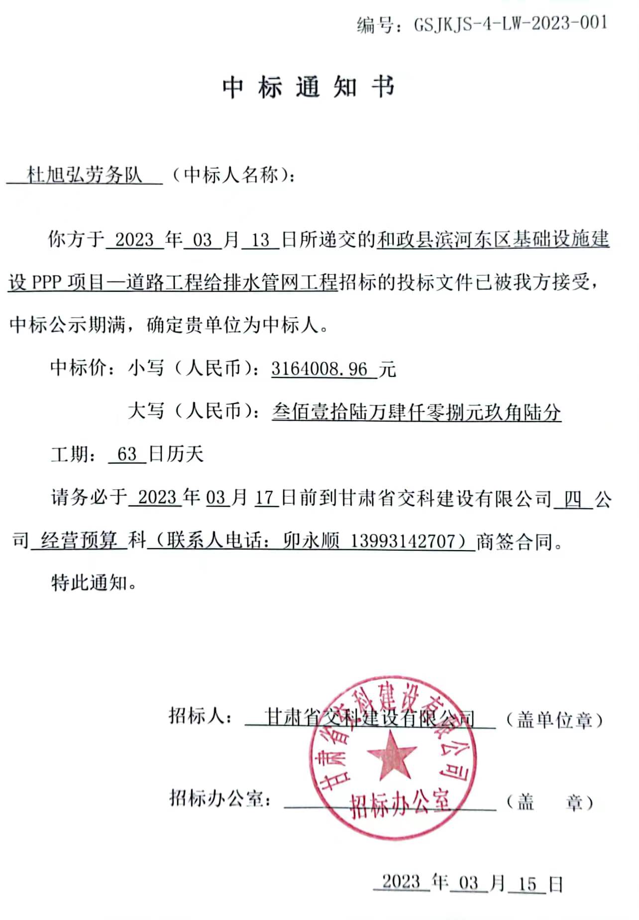 和政縣濱河?xùn)|區(qū)基礎(chǔ)設(shè)施建設(shè)PPP項(xiàng)目-道路工程給排水管網(wǎng)工程-中標(biāo)候選人及中標(biāo)通知書