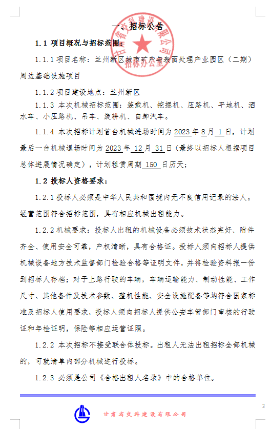 蘭州新區(qū)城市礦產(chǎn)與表面處理產(chǎn)業(yè)園區(qū) (二期)周邊基礎(chǔ)設(shè)施項(xiàng)目-機(jī)械租賃招標(biāo)公告
