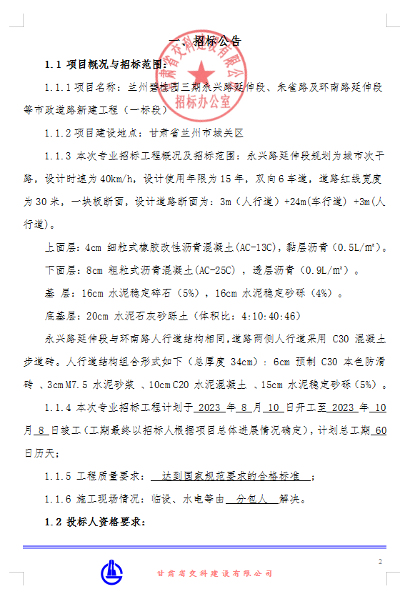 蘭州碧桂園三期永興路延伸段、朱雀路及環(huán)南路延伸段等市政道路新建工程(一標段)-專業(yè)分包招標公告