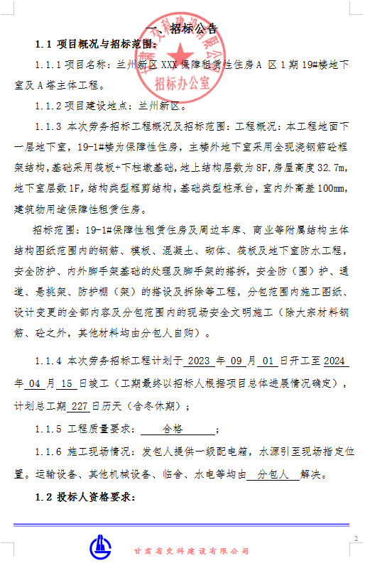 蘭州新區(qū)XXX保障租賃性住房A 區(qū)1期19#樓地下室及A塔主體工程勞務(wù)招標(biāo)公告