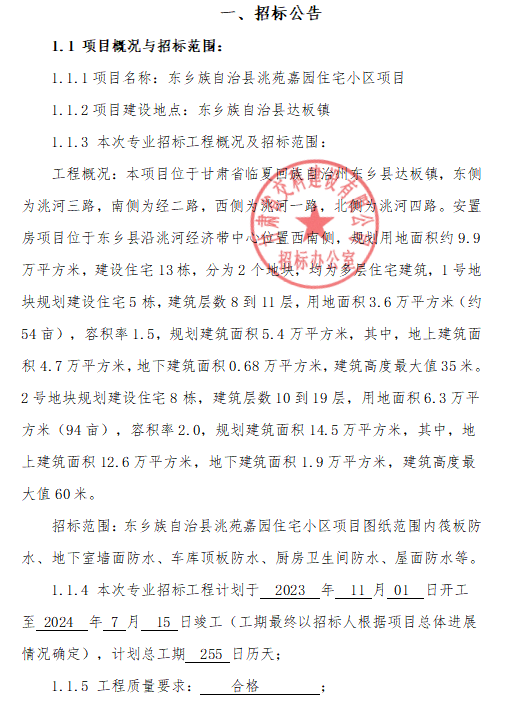 東鄉(xiāng)族自治縣洮苑嘉園住宅小區(qū)項(xiàng)目專業(yè)分包招標(biāo)公告