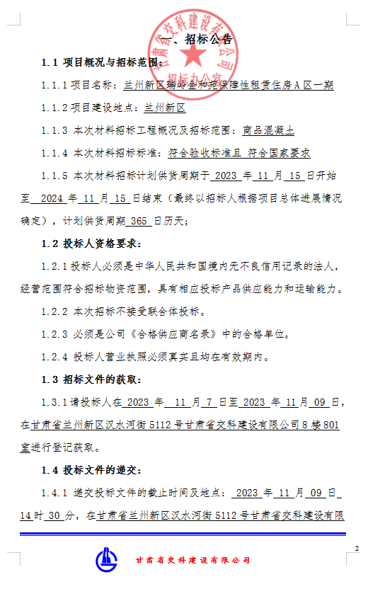 蘭州新區(qū)瑞嶺金和苑保障性租賃住房A區(qū)一期-混凝土招標(biāo)公告