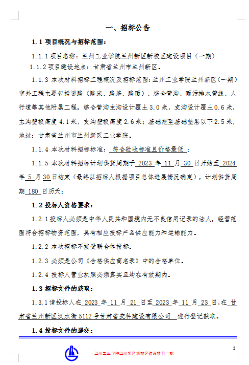蘭州工業(yè)學(xué)院蘭州新區(qū)新校區(qū)建設(shè)項(xiàng)目(一期)--材料招標(biāo)公告