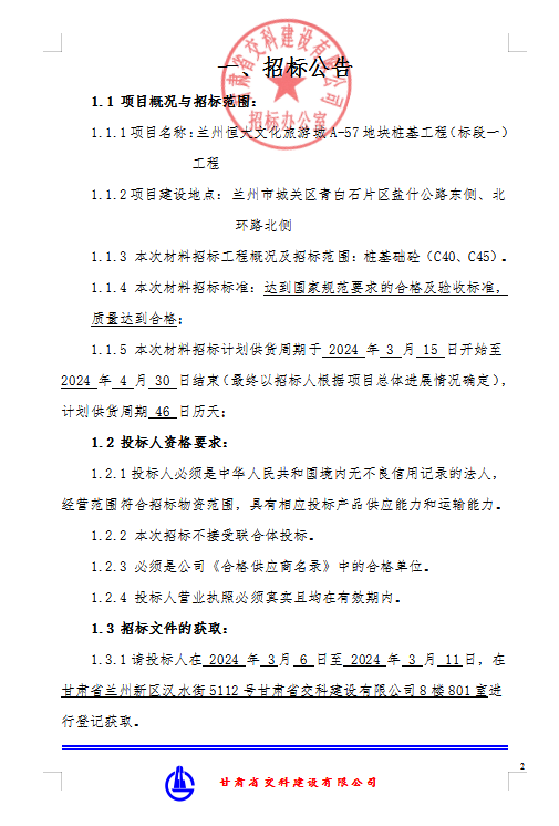 蘭州恒大文化旅游城A-57地塊樁基工程(標(biāo)段一)混凝土招標(biāo)公告
