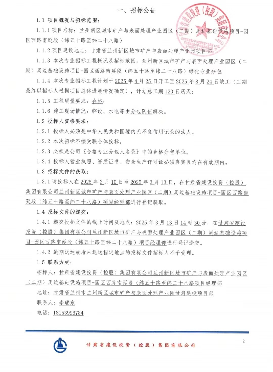 蘭州新區(qū)城市礦產(chǎn)與表面處理產(chǎn)業(yè)園區(qū)(二期)周邊基礎(chǔ)設(shè)施項(xiàng)目-園區(qū)西路南延段(緯五十路至緯二十八路)綠化專業(yè)分包-招標(biāo)公告