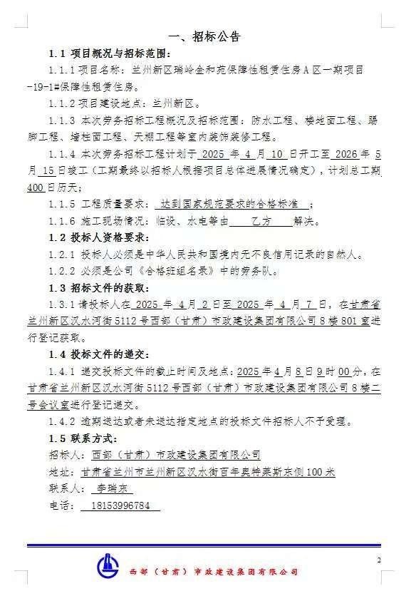 蘭州新區(qū)瑞嶺金和苑保障性租賃住房A區(qū)一期項(xiàng)目-19#-1#保障租賃住房-防水工程、樓地面工程等勞務(wù)分包招標(biāo)公告