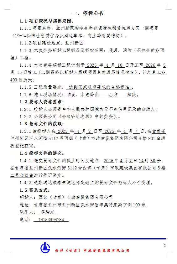 蘭州新區(qū)瑞嶺金和苑保障性租賃住房A區(qū)一期項目-19#-1#保障租賃住房及周邊車庫、商業(yè)等附屬結(jié)構(gòu)-暖通、消防勞務(wù)分包招標公告