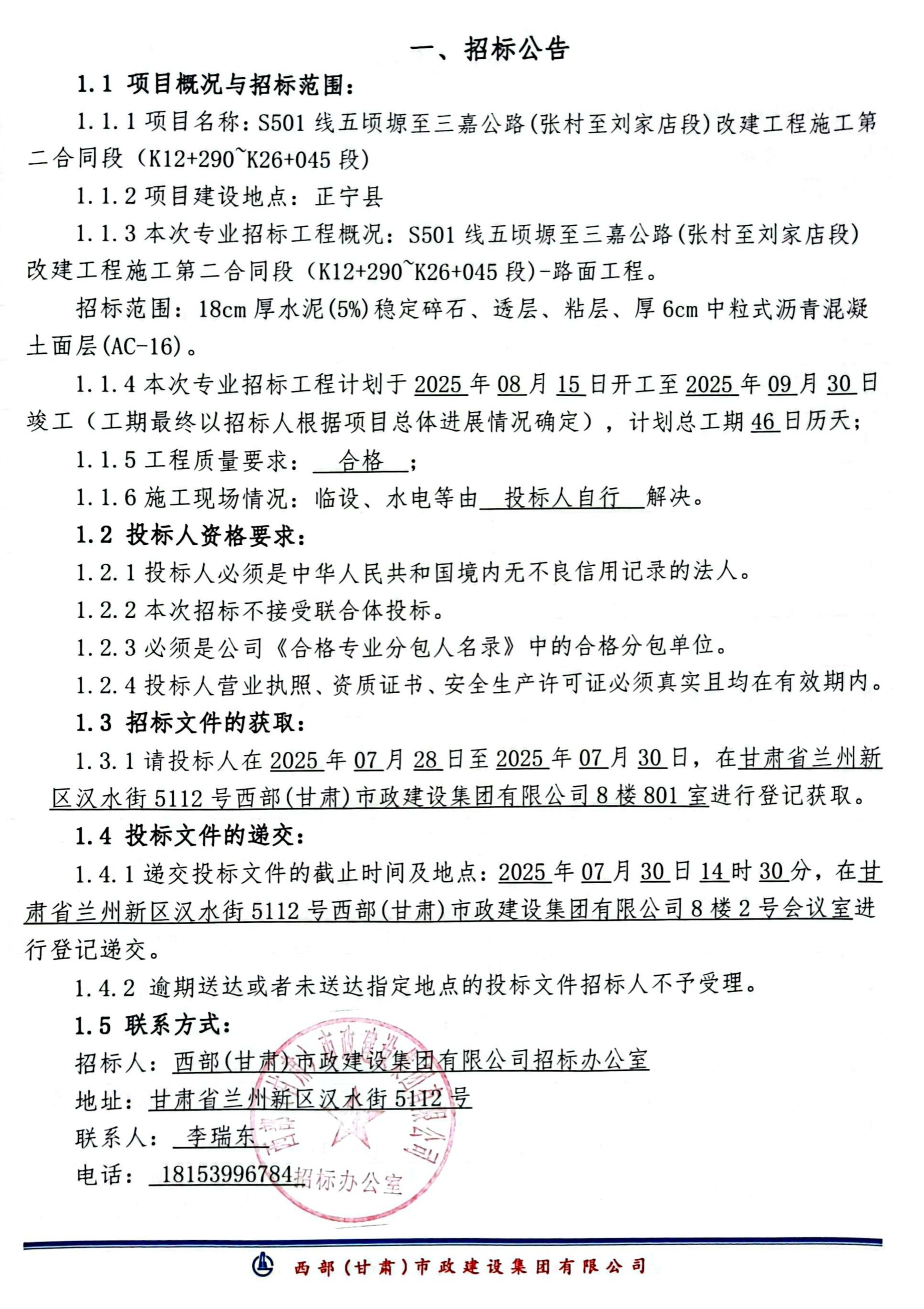 S501線(xiàn)五頃塬至三嘉公路(張村至劉家店段)改建工程施工第二合同段(K12+290-K26+045段)-專(zhuān)業(yè)分包-招標(biāo)公告