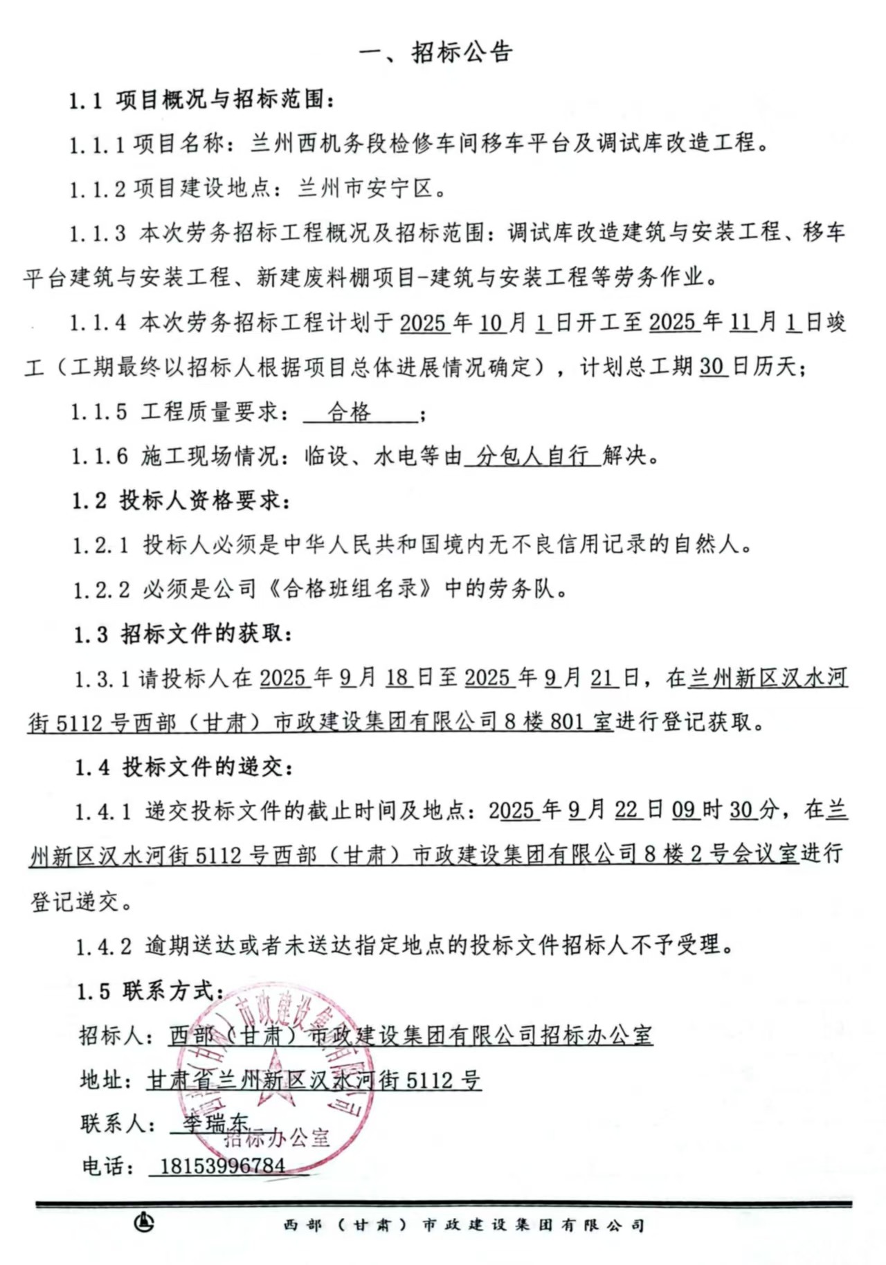 蘭州西機(jī)務(wù)段檢修車間移車平臺(tái)及調(diào)試庫(kù)改造工程-勞務(wù)分包招標(biāo)公告